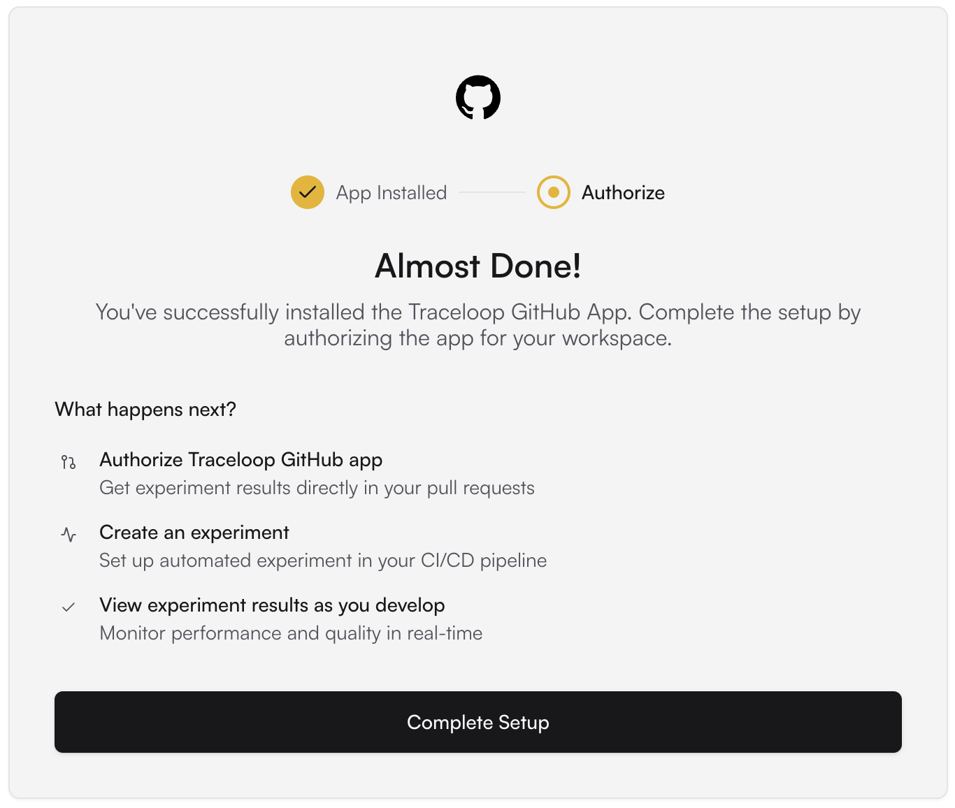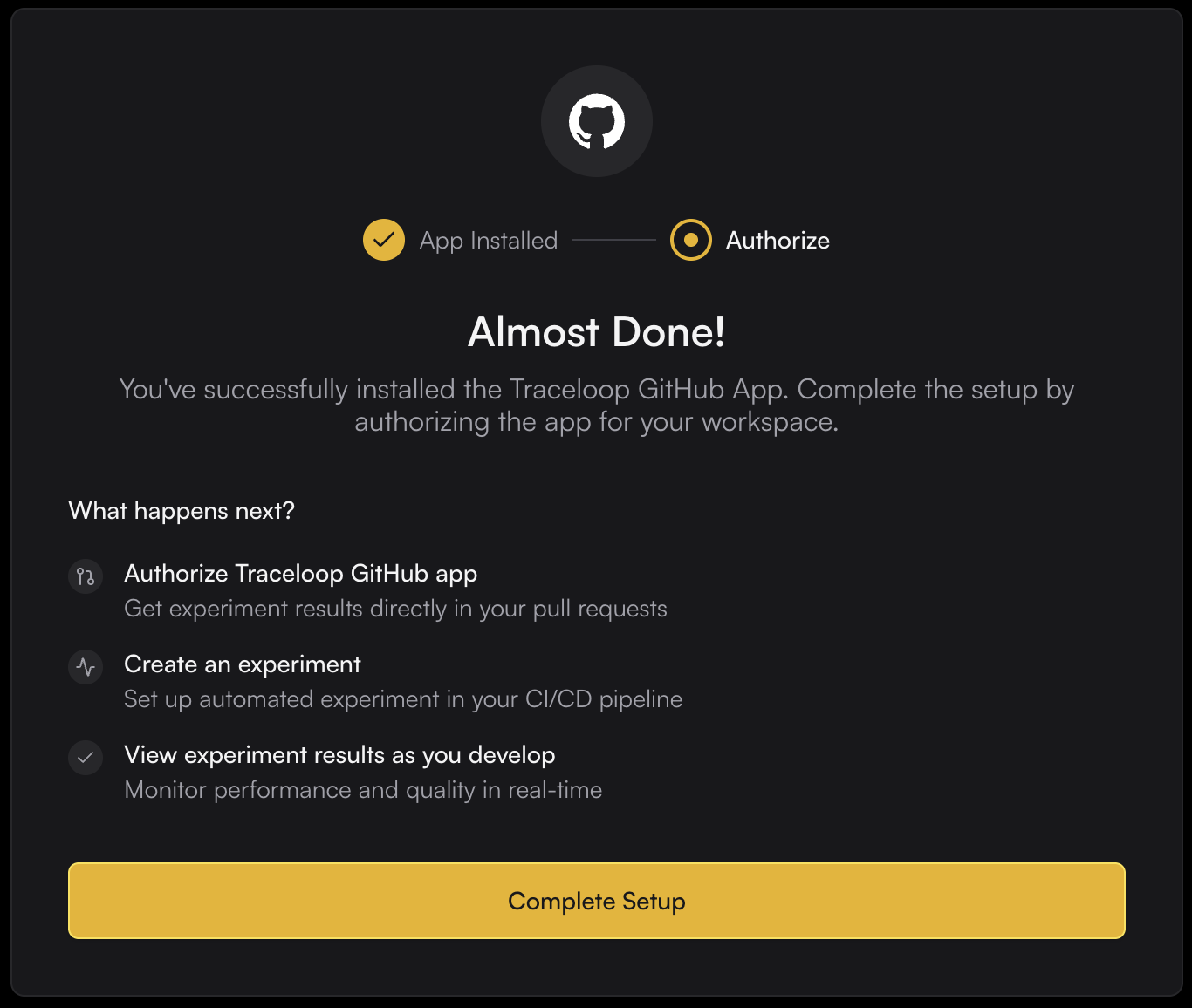 Go to the integrations page within Traceloop and click on the GitHub card.Click “Install GitHub App” to be redirected to GitHub where you can install the Traceloop app for your organization or personal account.