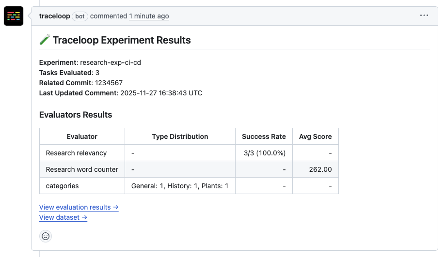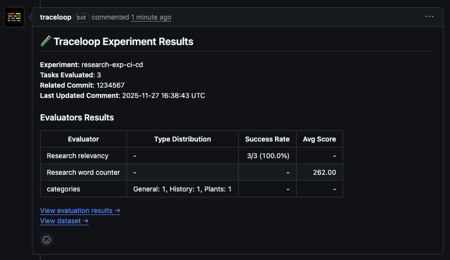 Once configured, every pull request will automatically trigger the experiment run. The Traceloop GitHub App will post a comment on the PR with a comprehensive summary of the evaluation results.