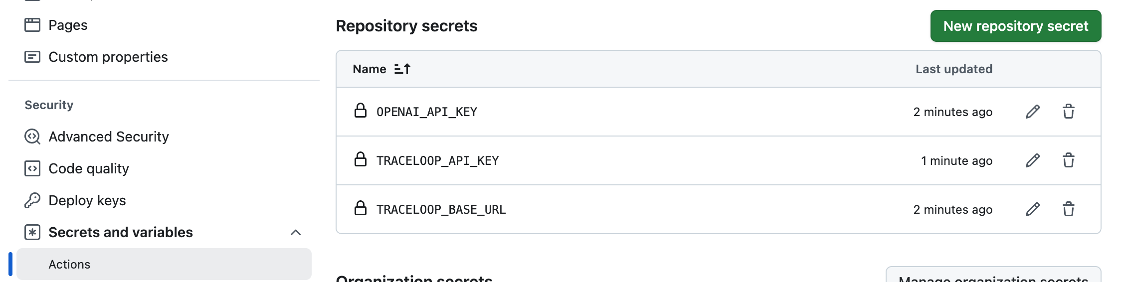 TRACELOOP_API_KEY to your GitHub repository secrets. Generate one in Settings →