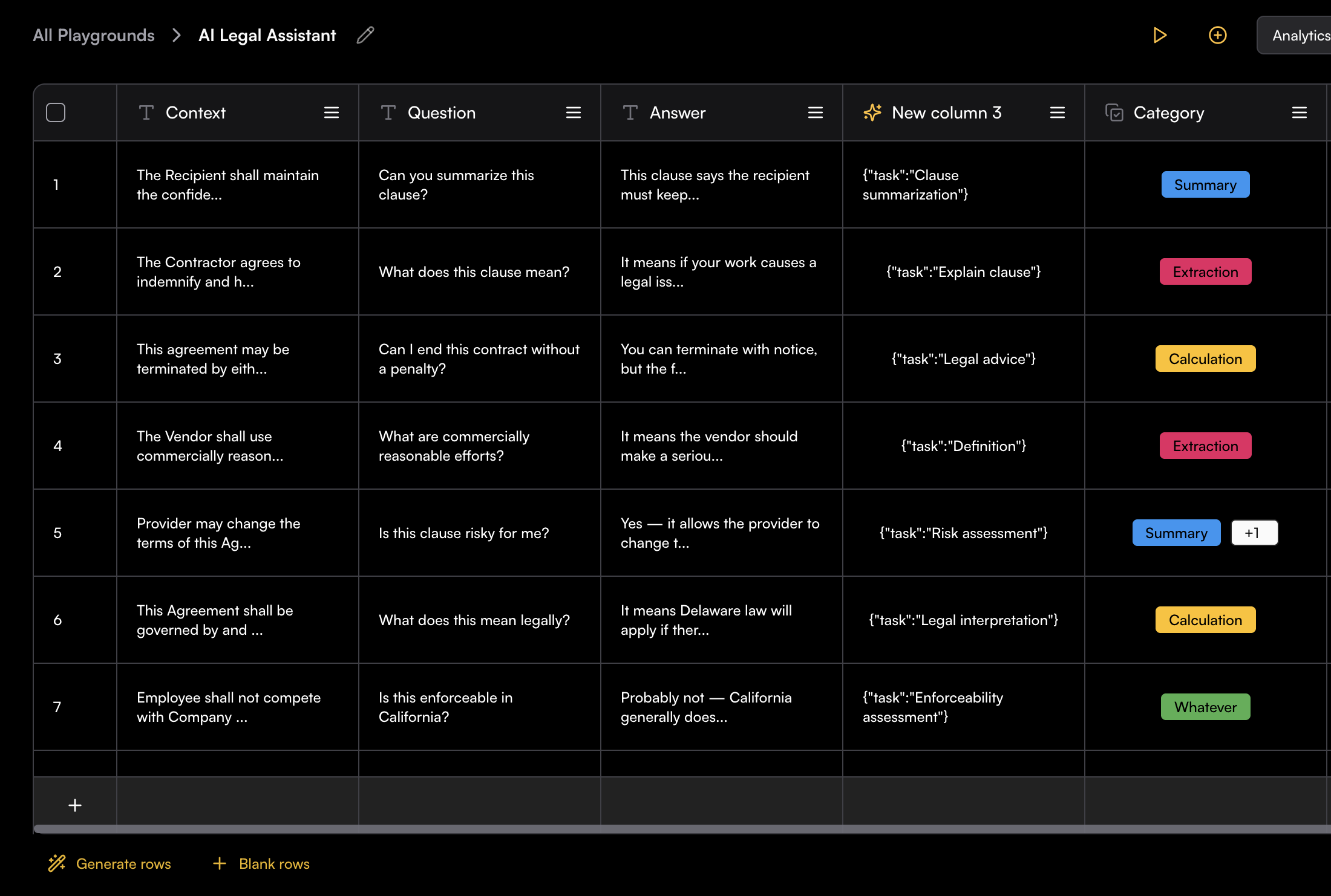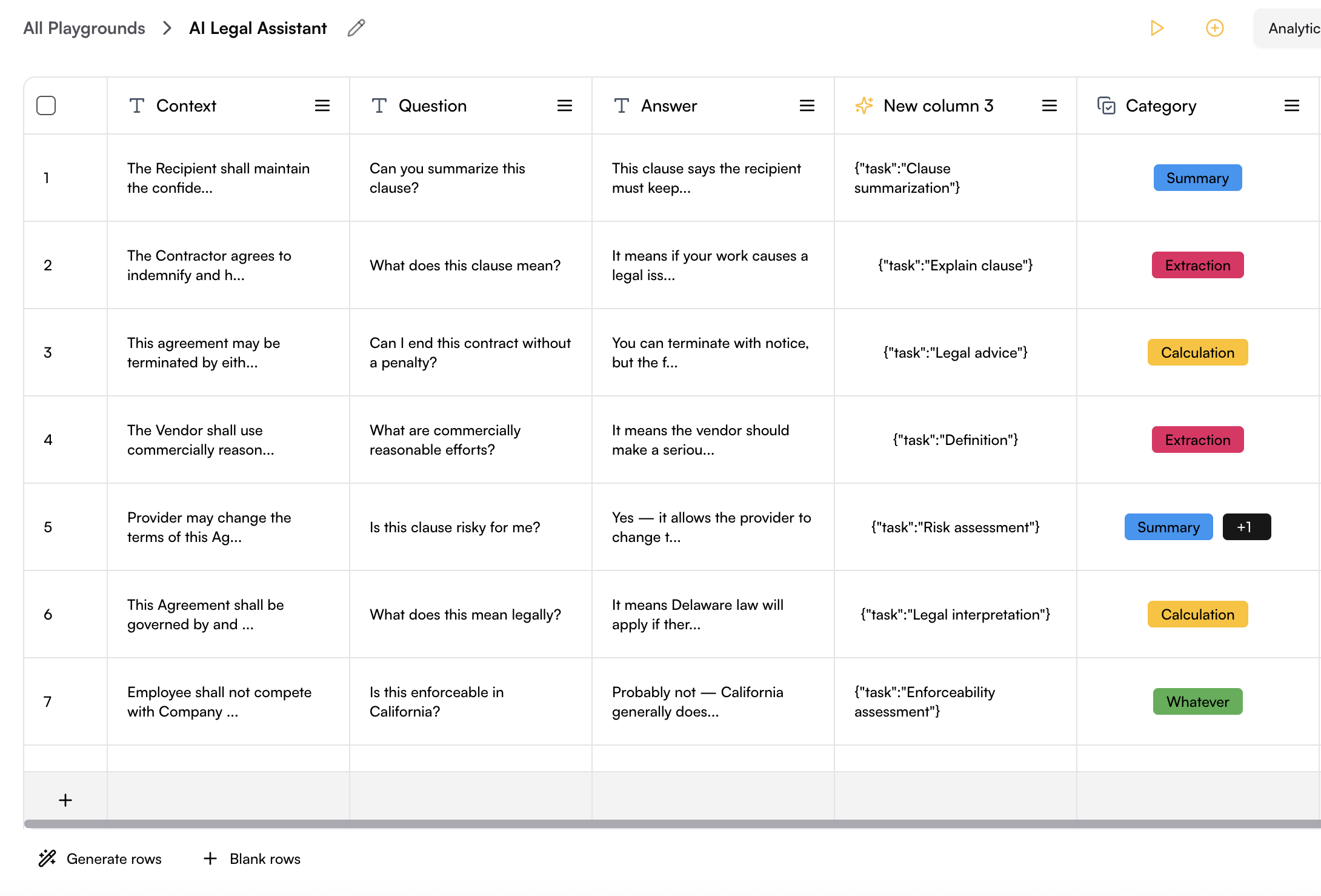 - Generate Rows: Use the AI row generator to create new rows based on the existing data in your Playground.